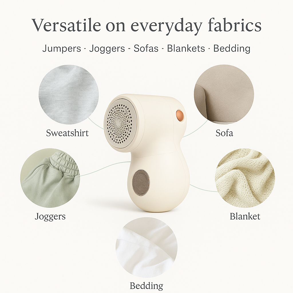 The Kaylia Klean Fabric Shaver brings your jumpers, joggers, sofas, blankets, and bedding back to life — in just seconds.